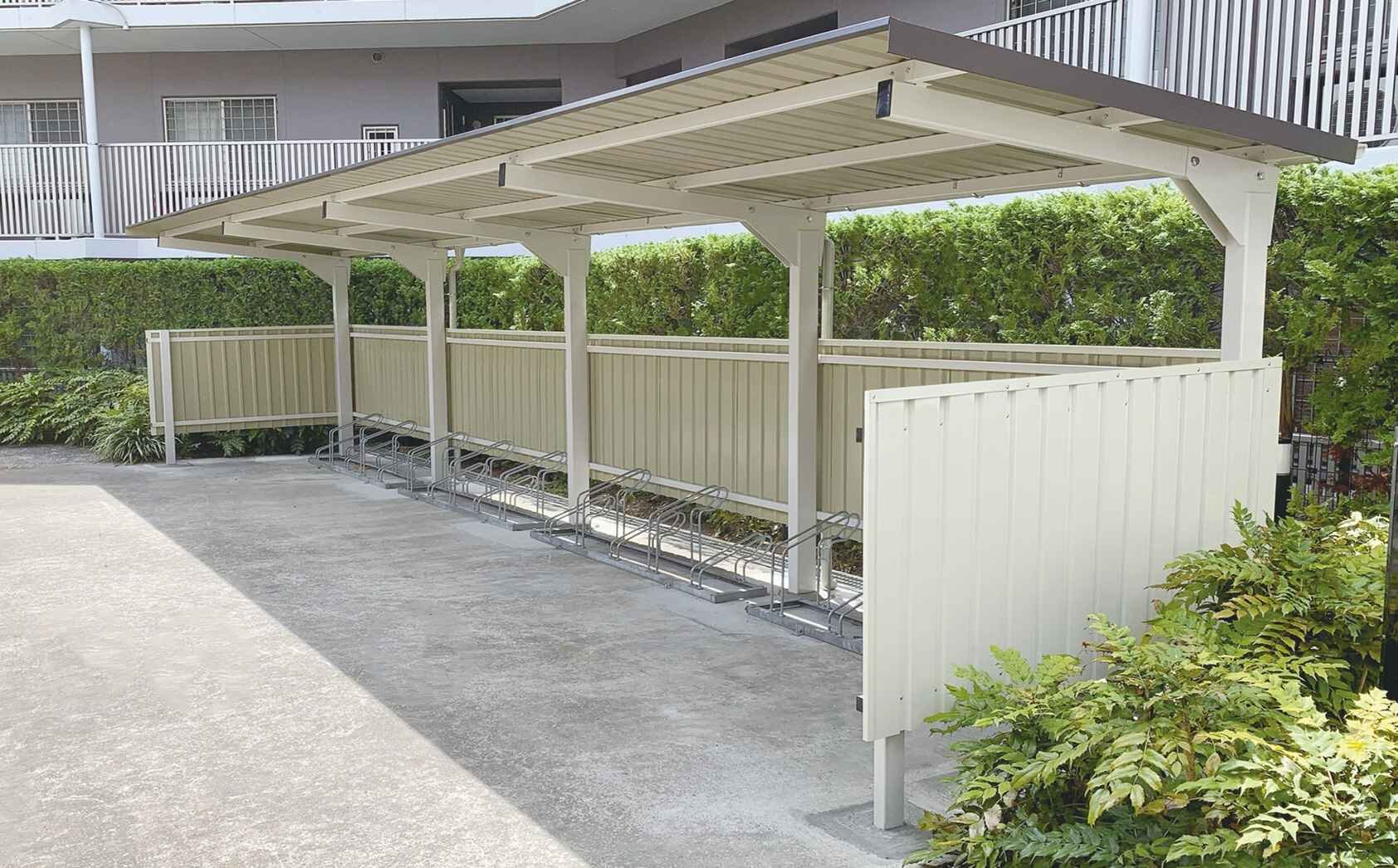 駐輪場屋根の背面部、側面部に設置。目隠し、風よけ、埃よけ、遮光用などに。